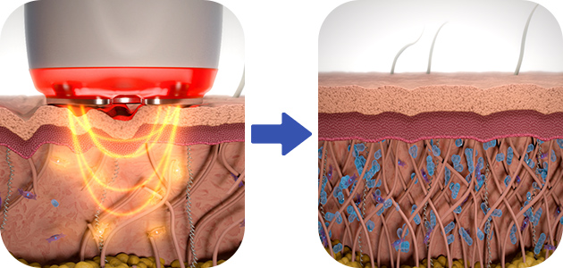 ハンドピースに備え付けてある630nmのLED光は、コラーゲンと線維芽細胞の合成促進を促します。これにより細胞の若返りを助け、再生能力を高めることができます