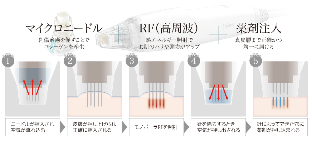 またその針の先からさらにRF(高周波)を照射して、真皮層まで直接熱を加えることで肌のタイトニング効果やたるみ改善にも効果があります。